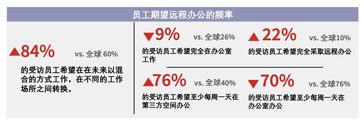 中国员工理想的混合办公模式是:2.2天在办公室办公,1.1天在第三方空间办公,1.7天居家办公。然而在远程办公时,59% 受访者表示会想念在办公室里良好的人际互动,57%想念可以在工作所轻松获得的设施设备,51%想念与同事面对面的直接协作。