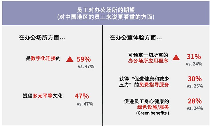 在谈及对工作场所的期望时,中国员工青睐良好数字化互联、多元包容平等的企业文化,如便捷的工作场所应用程序及预定、免费的健康及减压辅导、以及促进身心健康的绿色设施及服务。